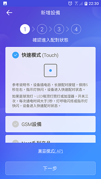 當開關燈號連續快閃時,點選下一步進入WIFI設定