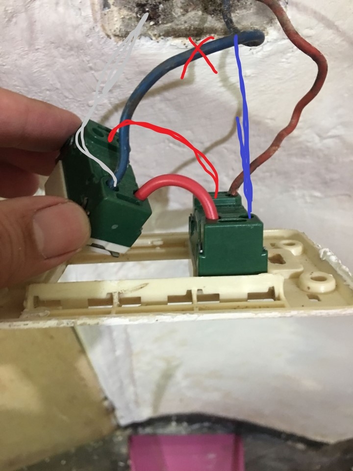 這是廁所開關線兩條出線圖1,很正常的功能裝上開關就可以正常開跟關,但是我想多裝一個插座,不知可不可以?還是必需在從裡面牽一條線出來?因為我很天真的想說一條接開關,一條接插座,然後開關跟插座在接一條連結圖2,結果這樣接法不行,只能開關正常,插座缺沒電,所以?我想請問是不是要從哪裡在接一條線過來才可以?懊惱中....
