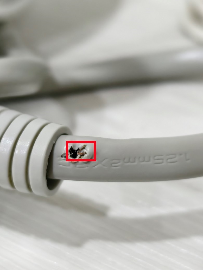 正如二樓所說的,這是收納使用習慣不良造成的,收納電線時反覆彎折過度,內部銅絞線因金屬疲勞效應一根根逐步斷掉,可通電的銅心變少電阻變大,這高電阻處的溫度就升高了,最後超過絕緣層耐溫燒掉。我家也遇過這種情形,我的作法是教育家人收納電線正確方式,還有拆開來換一條電源線,有隻烙鐵根焊錫就可以換了,材料行一條不貴,百來塊就有了,如果機構容納得了的話,電線線徑可以選2.0mm平方以上的絞線(看圖上原本的是1.25mm平方)。