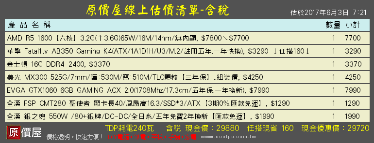 SCSACA wrote:目前主要需求就是寫...(恕刪) 1060 基本上 450w 即可, 沒要金牌的話拿銀之魂 550 也可以不過不要拿 msi 那張, 9k 直接上 1070 就好板卡改 5 年保, 配置差不多, 比較便宜的SSD 沒特別理由拿一般 2.5" 規格就好, M.2 還要顧慮散熱問題