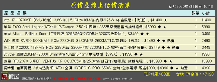 50K的話可考慮以下菜單,遊戲機滿夠用。CPU:AMD R7 3800XT (8核16緒)MB :TUF GAMING X570-PLUSRAM:KLEVV科賦 32GB (16G*2) DDR4 3200 BOLT X系列 CL16VGA:技嘉 RTX2070 SUPER GAMING OC 3X 8GSSD:ADATA XPG SX8200 PRO 1TBHDD:TOSHIBA 2TB(DT01ACA200) /7200轉PSU:海韻 FOCUS GX-650(650W)雙8/金牌/全模組/10年保CHASSIS:be quiet Pure base 500DX (BGW37)其它-散熱:酷碼Master Air MA621P 雙塔雙扇