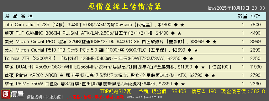 癡情男子漢0240 wrote:玩20年前的線上遊戲跟上網看影片多開很多瀏覽分頁、看看股票這樣而已 全白海景房9500F +9060XT-16G +CL28低延遲 +B850 +C930-2T菜單給你參考!要高CP值這些需求,直接用245K內顯即可勝任菜單給你參考!