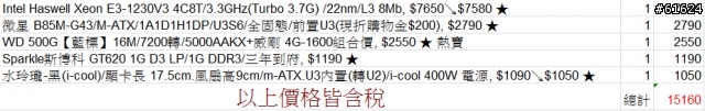 繪圖卡先省起來吧 等之後有實際賺到錢再說我自己的朋友在事務所上班他的電腦配備是這樣子的據他表示這樣就很夠用了甚至他還沒有SSD 應付大多數的工作量也是綽綽有餘品 名 產 品 名 稱 備 註 數量 小 計處理器 CPU Intel Haswell Xeon E3-1230V3 4C8T/3.3GHz(Turbo 3.7G) /22nm/L3 8Mb, $7650↘$7580主機板 MB 華擎 B85M Pro4/M-ATX/1A1D1H/U3S6/全固態/前置U3/註冊送NBA2K13(紅綠省$100), $2690記憶體 RAM 金士頓 HyperX blu 1600單條8GB超頻(KHX1600C10D3B1/8G) $1950內接硬碟HDD|固態SSD WD 500G【藍標】16M/7200轉/5000AAKX/二年保, $1660金士頓HyperX 120G(SH103S3-120G) 9.5mm/讀:555MB/寫:510MB/24nm/三年保固, $3170燒錄器 CD/DVD/BD LITE-ON iHAS324/24XDVD燒錄(黑), $489顯示卡VGA Sparkle斯博科 GTX650 1G D5 三年到府【最超值的遊戲卡首選】$2499CASE 機殼(+電源) Xpreadator-X1(惡魔紅)顯卡長 27cm.風扇高16.5cm/U3內置.SSD*6/上方排氣, $1490電源供應器 曜越 TR2-450P/ 450W 電源 80+ 銅牌.日系主電容 , $1690TDP耗電244瓦 含稅 現金價:23218 紅綠配現省 280 現金優惠價:22938