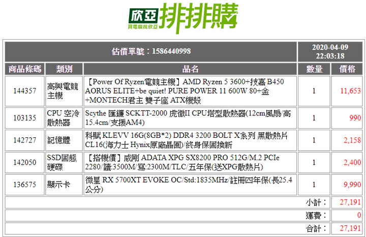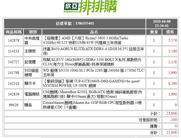 R5-3600主機板 B450記憶體8G*2 跑16G OKPcie M.2 SX8200 比較實在5700XT 基本效能比2060 高很多Power 600W 金牌Case 雙子座 前2 14CM 風扇