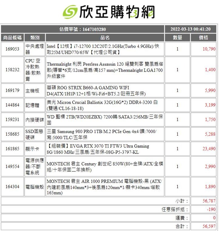 推薦你用12700+B660-PLUS-WIFI D4記憶體配美光3200 16G*2硬碟用980 PRO 1TB+SEAGATE 2T顯卡配3070 TI FTW3CASE跟PSU用750 GA+AIR 1000 LITE另外配顆PA120