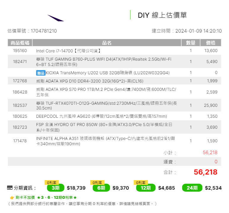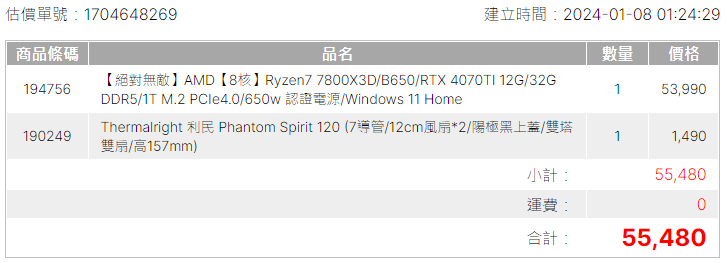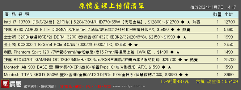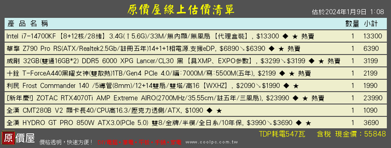cookiescookieeee wrote:預算是55k(小爆)...(恕刪) 除非你非常需要內顯不然板子都拿 z790 了, cpu 差沒多少上 k series56k 不含 os, i7-14700kf, 32g, 4070ti板卡一樣都選五年保的, cpu 上 14700kf, ram 上 DDR5-6000 CL30散熱上 fc140, 機殼看個人喜好, 電源拿 10 年保金牌 850w55k 小爆不含 os, i7-14700kf, 32g, 4070ti