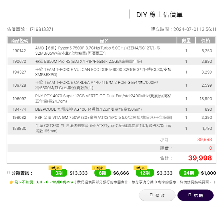 偉韋 wrote:平常主要玩LOL 3A...(恕刪) 你如果板子那個 wifi 沒有立即需求可以考慮買 z series通道多一點你之後加 SSD 的彈性比較大39k 不含 os, i5-12600kf, 32g, 4070 super版卡都選五年保的, 散熱上 ps120, 機殼看個人喜好40k 不含 os, r5 7500f, 32g, 4070 super