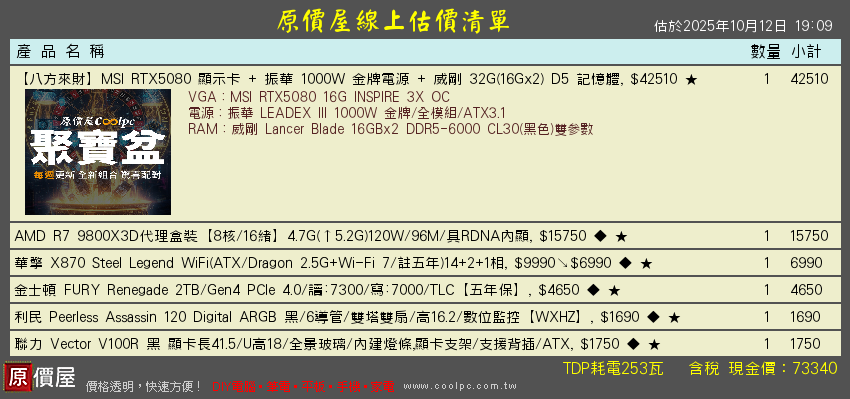 marx1964 wrote:預算7萬 遊戲機 9800X3D +5080 +用料更好X870八層板80A供電溫度還來的更低 +CL30低延遲反叛者2T +聯力V100R與ATX3.1振華1000W整體與原單好上不少的菜單給你參考!