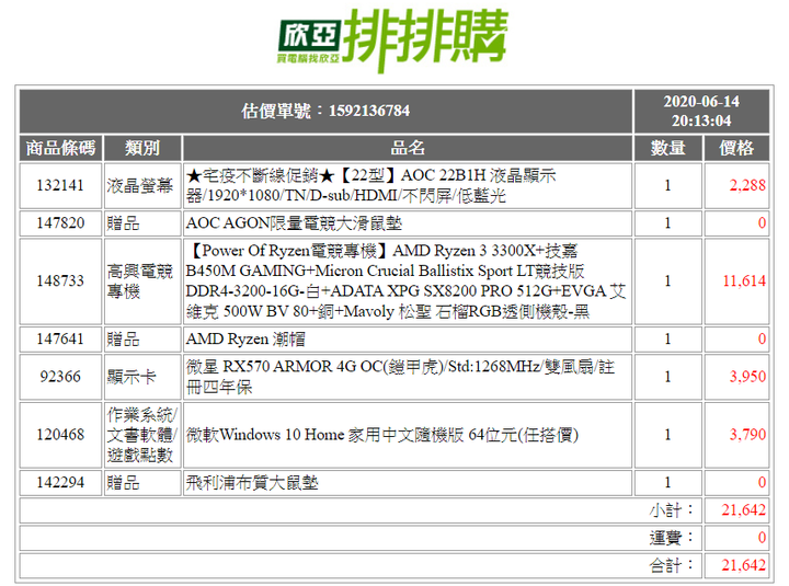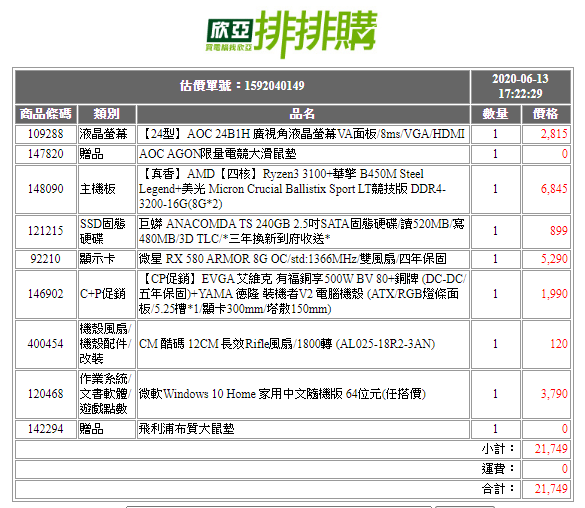 可以用組合配更划算處理器用 3100 四核八緒、文書多工 OK搭配主板 B450 華擎 Steel Legend送記憶體 8Gx2 跑雙通高頻顯示卡抓 Rx580 微星雙扇的電源就用 500W EVGA 銅牌五年保螢幕就配 24吋 AOC VA的、高 C/P這樣 21K 有含系統