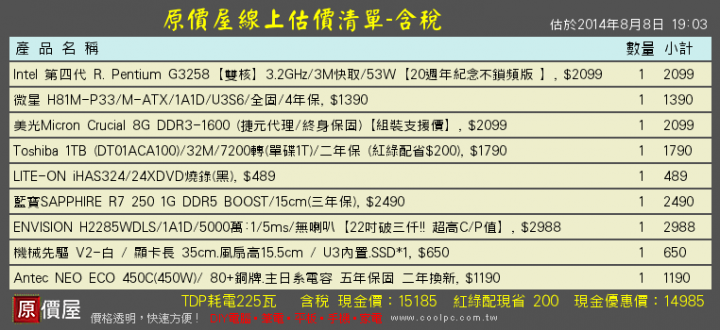 回V大因為這是另外組一台而非將電腦升級所以顯卡須另外買且這台使用時間只要撐2~3年即可 不做未來升級打算我以你的建議再配了2種G3258+H81M-P33 超頻至4GHzG3420+B85M-G會貴約200塊且C/P值好像沒G3258超頻後來的好?如果可以的話分析一下這2張單子的性能哪個較佳嗎?謝謝V大的指教