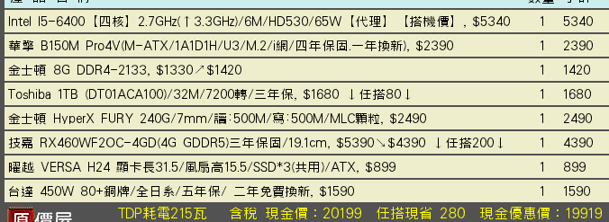 atj wrote:好的,請問內顯示看...(恕刪) 內顯看CPU...G4500開始 ~ I7-6700K 內顯都是HD530 (詳見估價單上的描述)唯有 Z170 主板才支援DDR4-2400以上..而 H110、B150、H170 主機板最高都只有支援到DDR4-2133買DDR4-2400可以插, 但會降頻跑2133(PS.現階段部分品牌記憶體2400比2133便宜)