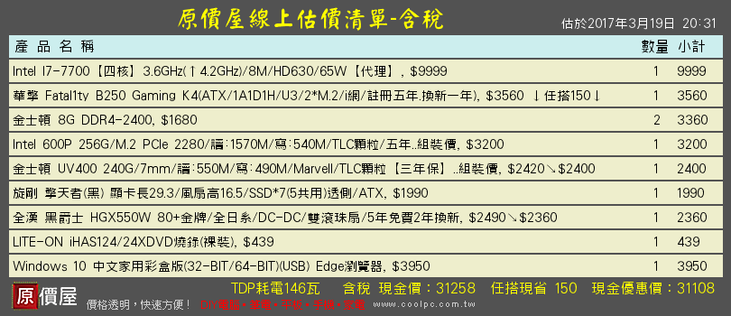 https://goo.gl/8c5av6這單比較好 作業系統自己去找 論壇裡有幾百而已還是正版我建議直接上k版 然後z版子這樣以後想超也可以 塔散我也選比較好的就算不超他基礎時脈也高很多絕對不要選你挑的那個電供~😂