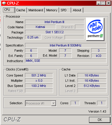 請問各位大大,手邊有顆好多年前的CPU!是PIII 500M卡夾式的。今天用cpuz1.409測了一下發覺,如附圖,規格處竟然是333M,請問這是正常的嗎?但是底下的時脈可以調到500M耶!請各位大大不要笑它老,它是第一部組裝的電腦,有感情存在的!謝謝有經驗的大大!再附上一張筆電的CPU,"規格"這欄感覺就很正常耶!