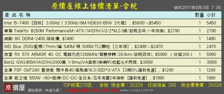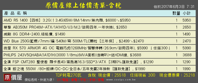 一七五 wrote:大家好朋友搬來台中...(恕刪) 25k 含螢幕小爆, i5 或 r5 1400, 8g, rx570沒什麼特別理由選 i5 就組 r5, 可以考慮搭 ab350m pro4 的組合預算有多再補 ram 跟硬碟可以去 sinya 找看看便宜的 rx480螢幕要 24" 便宜可以考慮 Philips 243V5QHABA 或 BenQ GW2455H