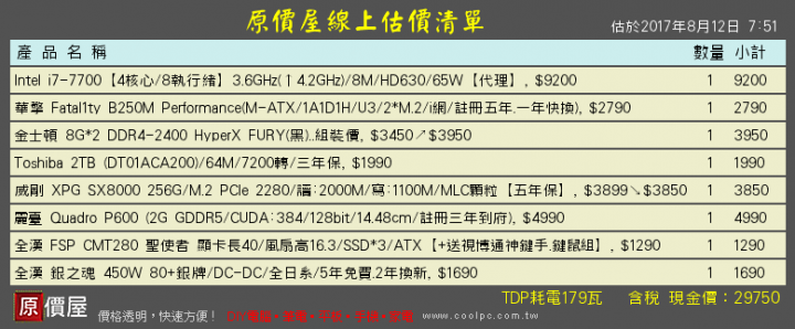 校長二號 wrote:小弟對電腦沒什麼研...(恕刪) 你條件給的有點不太夠不知道你要不要螢幕或是其他周邊這邊幫你配一張單主機參考看看CPU:Intel i7-7700主機板:華碩 PRIME B250M-A記憶體:金士頓 8G*2 DDR4-2400硬碟: SSD威剛 XPG SX8000 256G/M.2 PCIe (當系統)HDD Toshiba 1TB (存資料)顯示卡:NVIDIA Quadro K620機殼:全漢 FSP CMT280 聖使者電源供應器:全漢 金鈦極 V 550W 80+金牌這樣大約29K多一點