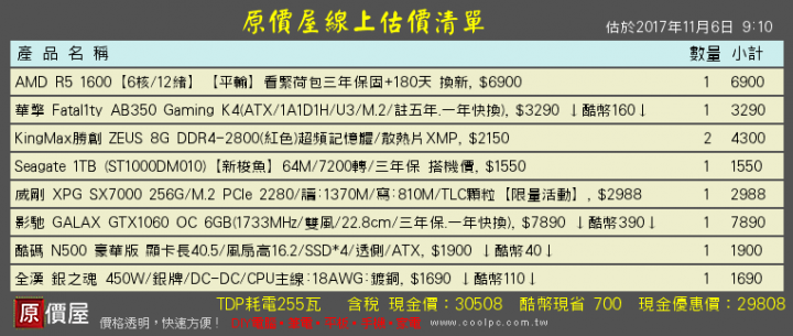 kevin13111895 wrote:小弟想組一台電腦來...(恕刪) 30k 不含 OS, i5-8400, 16g, 1060直接改拿八代 i5, SSD 換 SX7000, 1060 電源 450-550w 就夠了殼要 N500 的話直接拿 KKN1 的豪華版, 前置 USB 數量比較多沒有一定要組 i5 的話也可以考慮組 r5 1600, 板子換五年保的