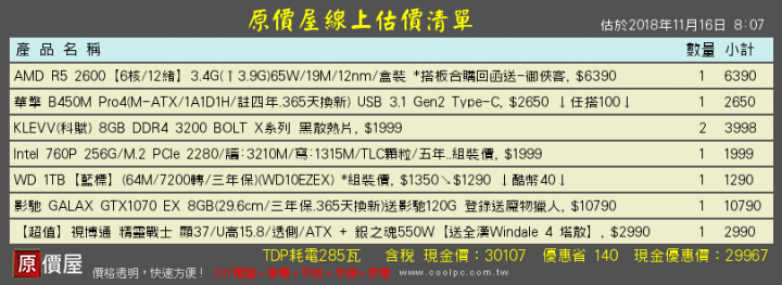 twkimo1199 wrote:新手發問 目前都在...(恕刪) 30k 不含 os, r5 2600, 16g, 1070預算有多的話硬碟可以加一點拿 2t 或 3t或是先拿 SSD 之後再補硬碟, 卡拚一下上 1070 ti