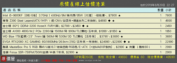 citizen9527 wrote:預算50K內,目標3A...(恕刪) 小爆一點 既然顯卡用2080 電源挑金牌比較好9600K比KF多個內顯價格也沒差多少硬碟建議拉PCIe SSD當系統碟再配顆HDDi5就算小超塔扇也很夠用 換掉水冷預算可以投到別的地方 這給你決定