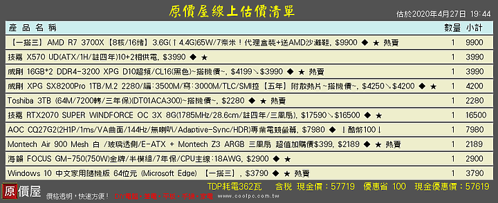 改拿R7-3700X會比較推薦主機板搭配X570及金牌等級電源記憶體拿3200-16G*2硬碟一樣1TB 固態搭配2TB HDD顯示卡一樣RTX2070組合價有搭配AIR900 建議再加ARGB三風扇組合螢幕去原屋買那台