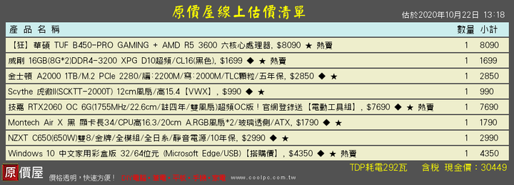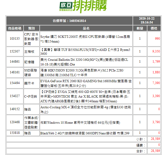 想請這邊的大神大大幫忙配 要SSD,機殼不要太花翹 自己有稍微看一下,目前的想法 主機版想以華碩B450+3600 顯示卡的話想法是2060 其他的要怎麼配穩定性、相容性要好 在請諸位大神指教 謝謝🙏🙏 ........10/24....更新 之後改成這樣在請各位大大看O不OK....謝謝