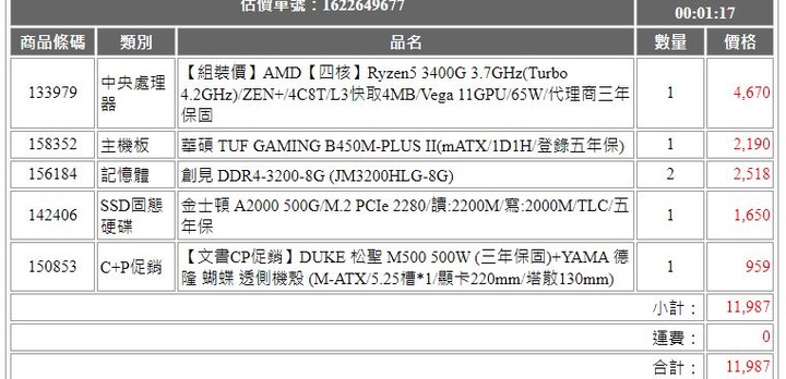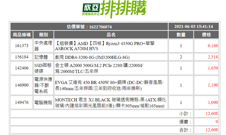 如果要效能再好點的話可拿新點 4350G 搭新板 A520M 更便宜記憶體加一條 湊兩條 8G-3200 跑雙通電源可拿好點 EVGA 450W 銅牌/五年保機殼拿散熱好 X1 有四扇 + 前/上網孔這樣是多一點 12K