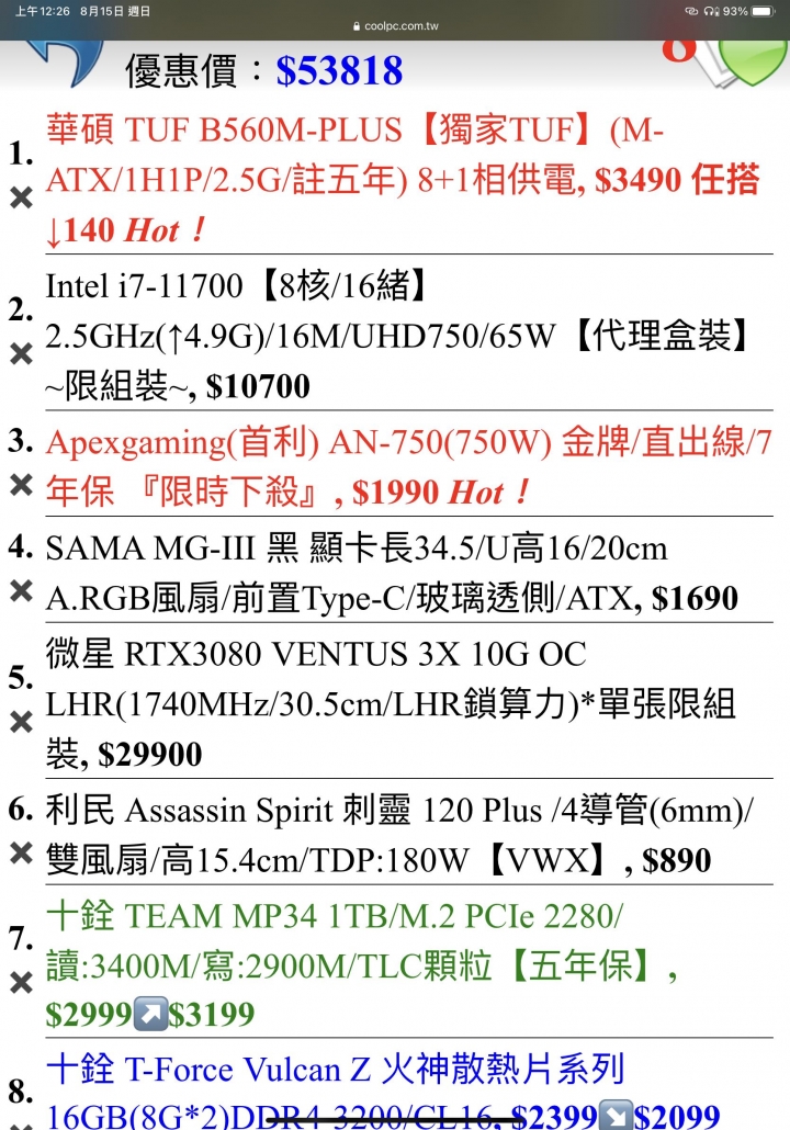 蘇蘇z wrote:請問各位大大我預算大(恕刪) SSD 沒特別理由別買 QLC 的預算夠 cpu 直接上 11 代就好, 況且 10 代沒有無內顯版本沒便宜多少2t 買高轉藍標就好, 與其板子拿 z590 還不如買個散熱器60k 含螢幕, i7-11700, 32g, 3060ticpu 上 11700, ram 上 32g, SSD 上 kc2500, 散熱拿空冷雙塔機殼看個人喜好60k 含螢幕, i7-11700kf, 16g, 3060ti