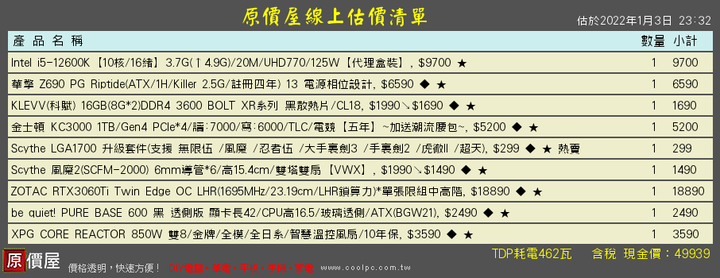HI大家好~目前電腦不敷使用想升級一下電腦! 之前都是買套裝電腦~效能基本上都很差! 想要重組一台效能好的電腦來[單開天堂M] 要求不要卡頓~目前打架偵數落在10~30間 根本當肉 預算上面 想要12代i7或i9 CPU 含顯示卡5~8萬預算都可以 機殼的部分就選擇散熱好低調(不要RGB燈那種五顏六色睡覺會刺眼) 另外抓了一個大大的配單參考~是否可行??