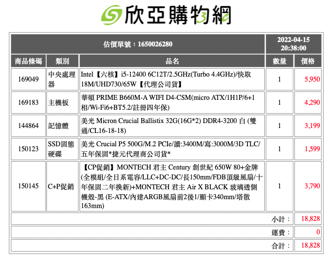原單大致上是沒問題配12700+16G記憶體+500G SSD但主機板我比較不會選技嘉你可以考慮這張B660M MORTAR WIFI DDR4最後選藝人店的CP組合 創世紀650W+AIR 1000機殼