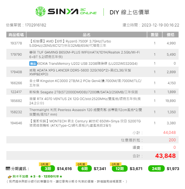 sullivanc70 wrote:預算40K,主要是打...(恕刪) 42k 小爆不含 os, r5 7500f, 32g, 4070板子改 2 dimm, ram 上 CL30, SSD 上 kc3000散熱上 ba120, 卡你要三風扇的話雞排便宜點機殼看個人喜好, 電源上 750w40k 小爆不含 os, r5 7500f, 32g, 407040k 不含 os, r5 7500f, 32g, 4070改這樣就 40k 內