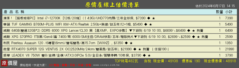 浩帶 wrote:想升級新電腦 以前沒...(恕刪) kc3000 1t 那個價格不如買 sn850x 或 t500卡 24k 你可以直接上 4070ti 了45k 不含 os, i5-12600kf, 32g, 4070ti版卡都選五年保的, 板子上 z790, SSD 改拿 sn850x卡上 4070ti, 散熱上 ps120, 機殼看個人喜好50k 不含 os, i7-12700kf, 32g, 4070ti super預算燒完的話, cpu 上 12700kf, 卡上 4070ti super40k 小爆不含 os, i5-12600kf, 32g, 4070 super