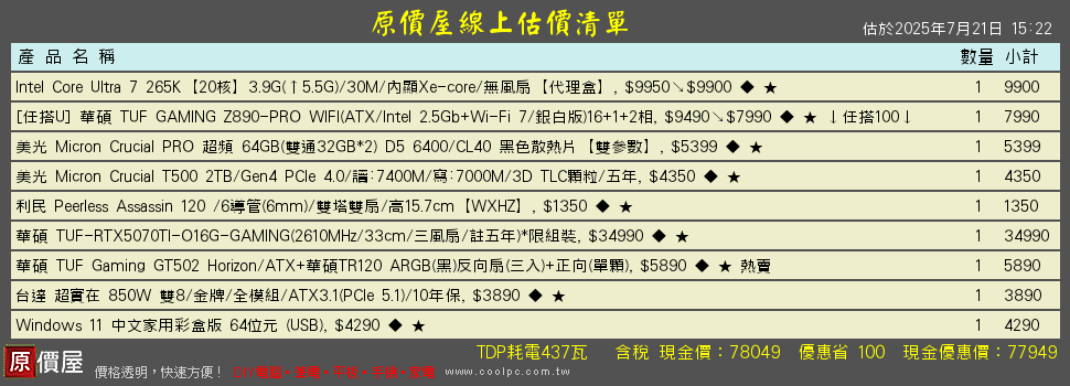 Intel Core Ultra 7 265K PassMark效能分數:58849AMD Ryzen 7 9800X3D PassMark效能分數:40004https://www.coolpc.com.tw/tmp/1753082576662703.pnghttps://www.coolpc.com.tw/tmp/1753082576662703.htmIntel® Core™ Ultra 處理器讓遊戲更順暢https://www.intel.com.tw/content/www/tw/zh/products/details/processors/core-ultra/play.html