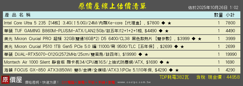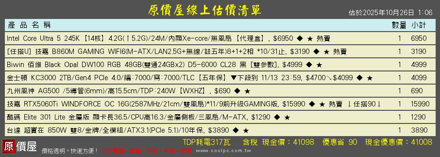 kenkingkimo wrote:主要用途上網、文書、ai數據分析、可能玩玩魔獸世界懷舊服,個人偏好N卡,電源供應海韻,機殼不要玻璃的 245K +5060ti-16G +CL28低延遲48G +B860 +KC3000-2T台達超實在10年保3年換新更好,板卡都是五年保固菜單給你參考!