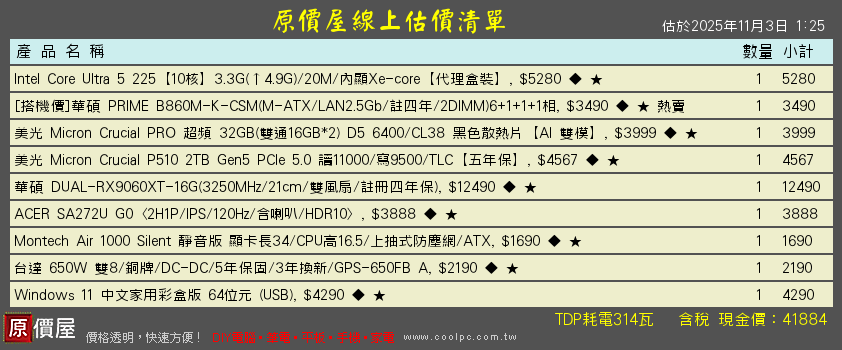 方案一:https://www.coolpc.com.tw/tmp/1762102069764009.pnghttps://www.coolpc.com.tw/tmp/1762102069764009.htm方案二:https://www.coolpc.com.tw/tmp/1762104309467763.pnghttps://www.coolpc.com.tw/tmp/1762104309467763.htmIntel Core Ultra 5 235 PassMark效能分數:39856Intel Core Ultra 5 225 PassMark效能分數:31082AMD Ryzen 5 7500F PassMark效能分數:26745Intel® Core™ Ultra 處理器讓遊戲更順暢https://www.intel.com.tw/content/www/tw/zh/products/details/processors/core-ultra/play.html