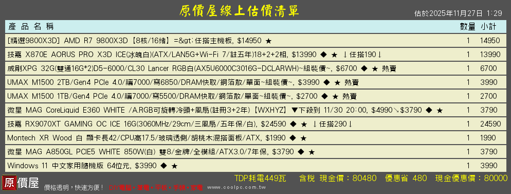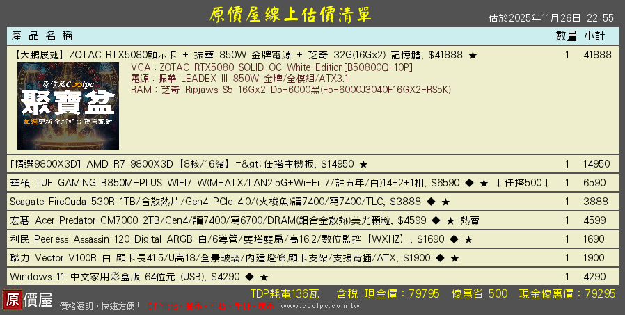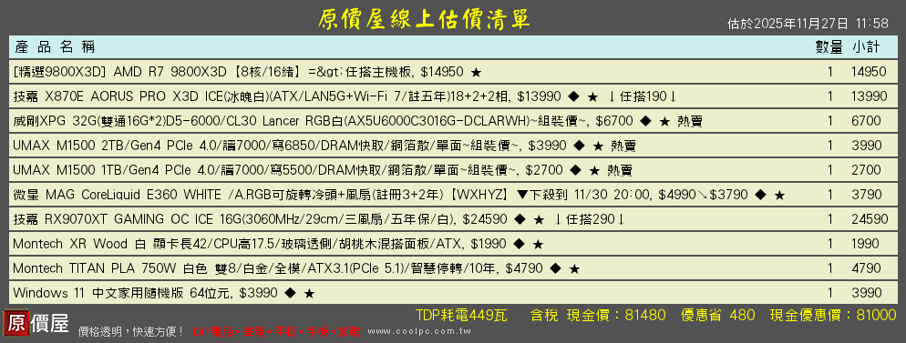 看著看著又有點混亂了白色主機已知固定的是CPU 9800X3D 和 顯卡 RX9070XT 白色然後主板我在B850和X870E做挑選 我選X870E懂得人可以說差別在哪記憶體雙通2條16G硬碟 1tb 2tb 各1 ,1個系統1個資料記憶體跟硬碟品牌隨便選的記憶體跟硬碟如果使用上沒差異那就換便宜的散熱我捨棄利民雙塔選微星水冷 畢竟搭透測機殼主機殼跟電供我選君主XR WOOD 白跟 君主750W 白如果沒問題我就送件組裝了