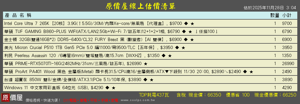 night8928 wrote:請問一下各位...(恕刪) 我比較建議選原價屋自配的天魔合體機,9800x3D + 5070ti 32GB 2TB,$59200,再買作業系統3990。比較省錢。若想買就要快下訂,好像快結束了。