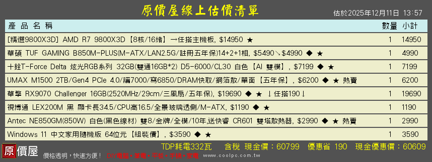 9800X3D +9070 +CL30低延遲 +B850用料好八層板80A17相供電溫度更低