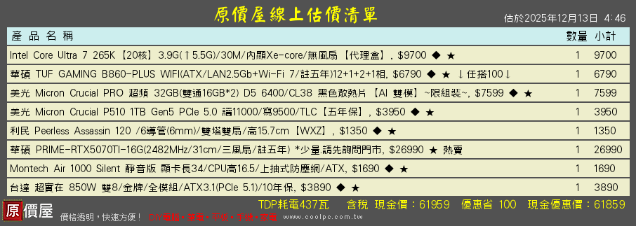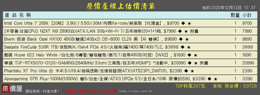johnchen3515 wrote:會直接推薦主板直接換成z系列搭配下面這些散熱 265K+TUF5070+用料頂規Z890八層板110A22相溫度低滿血320MHz Wi-Fi 7五年換新CL28低延遲48G+SSD用GEN4天花板火梭魚530R,水冷無整機漏液賠償都不用拿空冷即可!