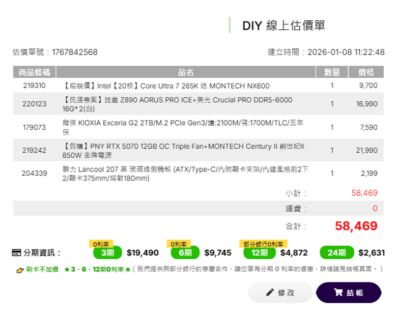 真的很感謝大家對我的幫助跟回答,我在這一小段時間內去學了點關於電腦配件的知識,還很淺薄都是去Google跟GPT查的,也沒想到預算也超出不少,又想到是要長期使用的就先忍痛選下去了,不知各位還有什麼建議,希望各位能指出不足。