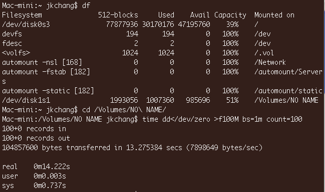 kentkent wrote:差蠻多的耶! 那我想...(恕刪) 我沒有外接碟,不過我用USB的隨身碟來試:在隨身碟產生一個100M的檔案,總共13.27sec ,平均7.8M/sec,如果在家目錄產生一個一樣100M的檔案:共3.41sec,平均30.7M/sec各位有外接usb or 1394 的硬碟可以試一下嗎?
