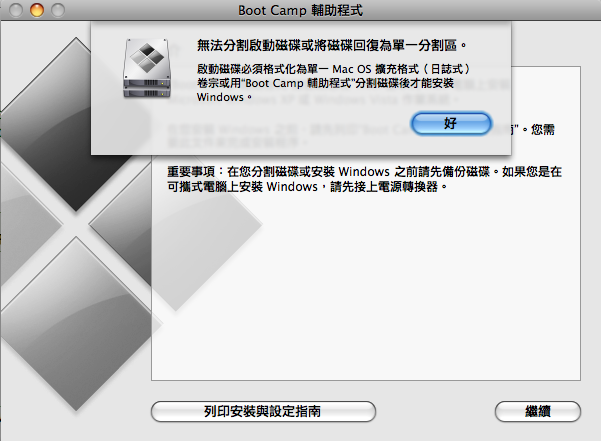 容孩子 wrote:因為有神密空間存在 所以磁碟管理工具都不讓我做事了QQ 你用那個 HD 開機當然不讓你做事 = =請使用OS X 安裝DVD 上的磁碟工具程式另一方面, Linux 的問題可以用 Linux 解決, Boot 進 Linux 的安裝 DVD 就可以分割 ah~Boot 進 Windows Vista 的安裝 DVD一樣可以