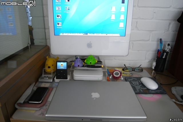 我也來分享一下我的桌面!今年十一月買的iMac 24吋、CPU 2.8GHz、4G RAM 拉近照…01上不知道有沒有拉飯^^||這是日本彩虹樂團(L'Arc~en~Ciel)買單曲STAY AWAY初回限定盤所抽的團員Q版限定公仔!還有限定版哥吉拉!左邊是SONY DSC-T10、Walkman NW-S205F、外接硬碟(仿Mac Style ^^)最後是Linkin Park DJ Joe Hahn所設計的全球限量500隻Mr. Hahn公仔!以及又是彩虹的吉祥物Ciel chan 2007年巡迴限定的週邊商品!好像買了太多限定的東西