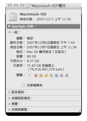 喵,怎麼圖片變小了XD我敘述一下,硬碟分配是80GB剩餘空間是 8.39GB而該硬碟目前的四個資料夾+剩餘空間:43.96 使用者+ 6.56 應用程式+ 3.77 系統+ 10.55 資源庫+ 8.39 剩餘空間_______= 73.23所以我有點不解,是其他系統檔案被隱藏嗎?
