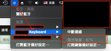 電腦畫面.上方狀態列.藍牙選單.滑鼠游標選裝置.有電量顯示.