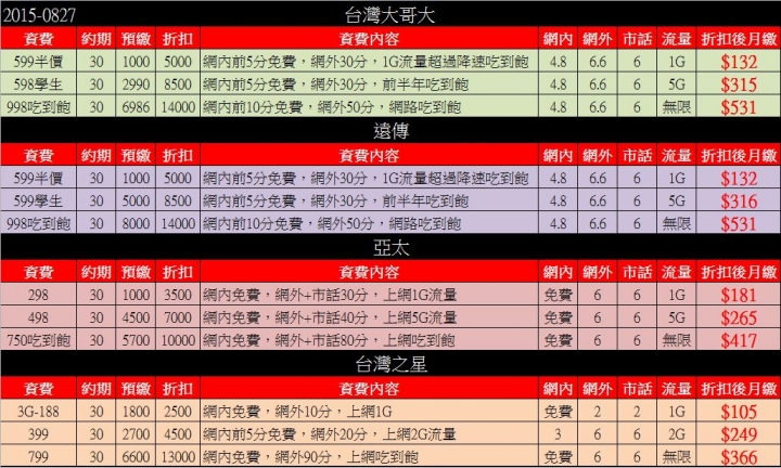 通話量:撥打手機/15分鐘內/月 (現在有line通訊軟體,基本上不會打到電話了) ; 撥打市話/15分鐘內/月