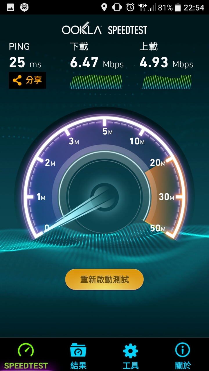 我去年底從亞太np到中華,結果只在去台北市玩的一兩天,測到破百mbps(站前新光),在台北市(站前,木柵,深坑,華山)平均約在40~60mbps左右up10mbps,其他都在台中市活動,最高是在上班前的台中工業區裡(約am07:40左右)有到30mbps,up5左右,其他時間,在逢甲周邊和台中市西屯,北屯,南屯,太平,這些地方,頂多10mbps,up3~5mbps左右,收訊滿格的地方不多,尤其是在逢甲住處,都是2~8mbps,up1~3mbps在跑,收訊只有1到3格,底下室收不到訊號,反倒以前的亞太,底下室還有3~5mbps,up還有1~2mbps。蠻後悔np到中華,當初到台中向x去np的時候,店員也有說中華不好,可是家人都是中華就沒辦法,在我常活動的區域,有2600的基地台,但是連3G的網路品質都不到,有幾CA的手機也沒用,我自己用Htc10,從亞太3G(小米2s)升到中華4G,對網路速度根本沒提升的感覺,反倒是以前亞太3G的速度還比較快一點。剛剛pm22:54測試的,台中太平,距離一中街約2公里,算鬧區,訊號和速度。。。。。唉