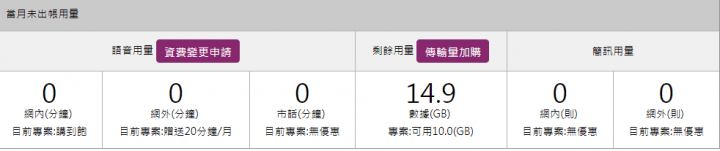 影呆呆 wrote:剛剛也99>139升級完成等待生效不過剛剛問客服她說因合約變更原有的流量不會延續!?目前99方案>10G流量未使用晚點看看生效後變多少流量=================回文還沒打完就合約生效了...流量10G變14.9G被吃掉5G QQ......應該是這個月的5G有保留之前的收回囉 應該不是之前的被收回你原本的10G是當月5G+遞延5G升級成139方案後每月變10G所以變成當月10G+遞延5G剩14.9G是沒錯的喔