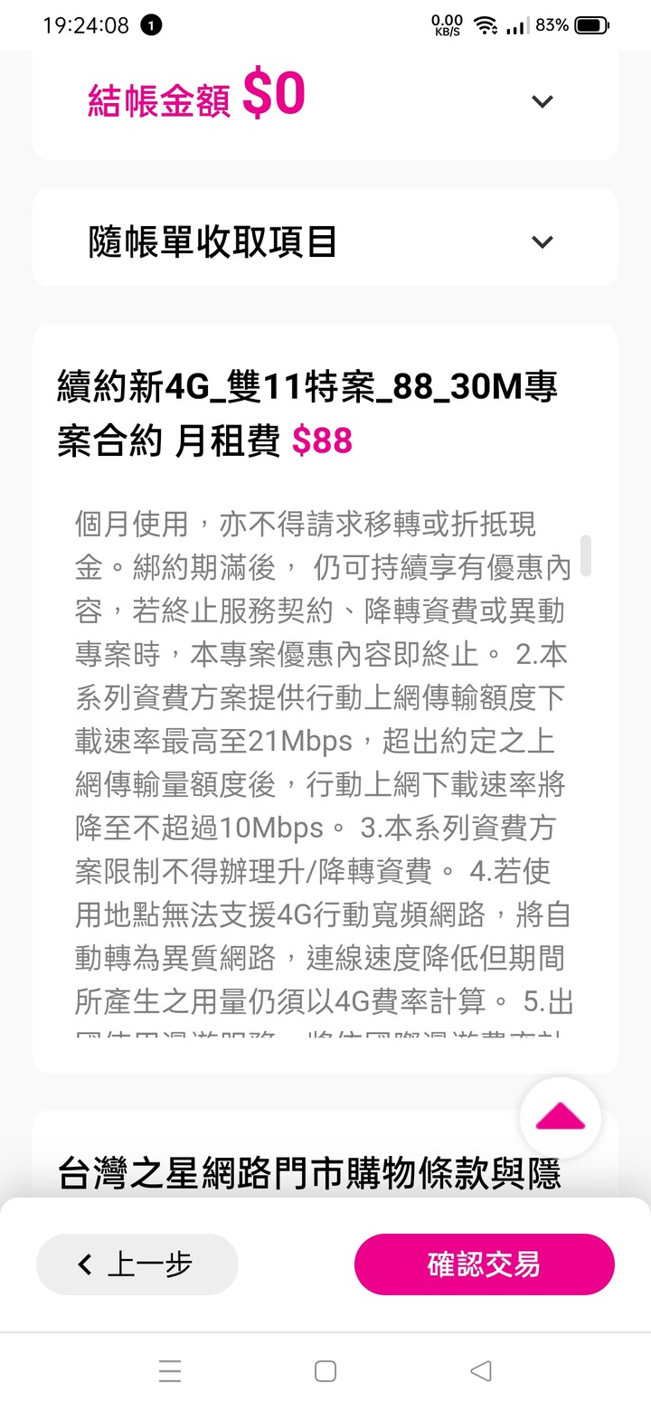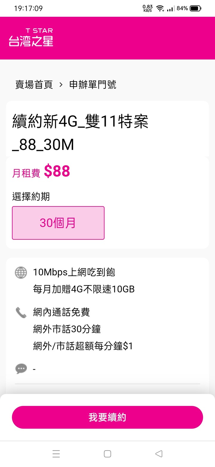 搜尋了一下,當年2019年雙11月租88的網速的確是21M過量降至10M,看來還是2020年雙11的188+99,月租99的比較好。今天把月租88的用電腦登錄進去,發現續約的話可以選擇188升速,如果對原本21M覺得太慢且通話比較大的,可以考慮喔。反之188的續約,就沒有88的選項囉。