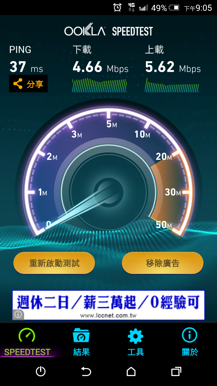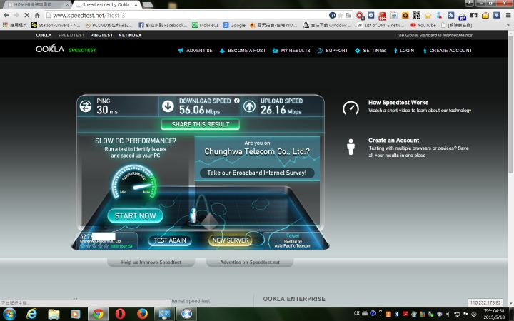 把手機接到AC51U分享器,再用RJ45接到電腦測直接用手機測...稍微快一點點可能你那邊比較多人用吧,我在桃園楊梅這邊另外我雖用中華門號,這支手機是台哥大品牌的Amazing X3...朋友續約台哥大拿的免費手機,他不要就便宜賣我...