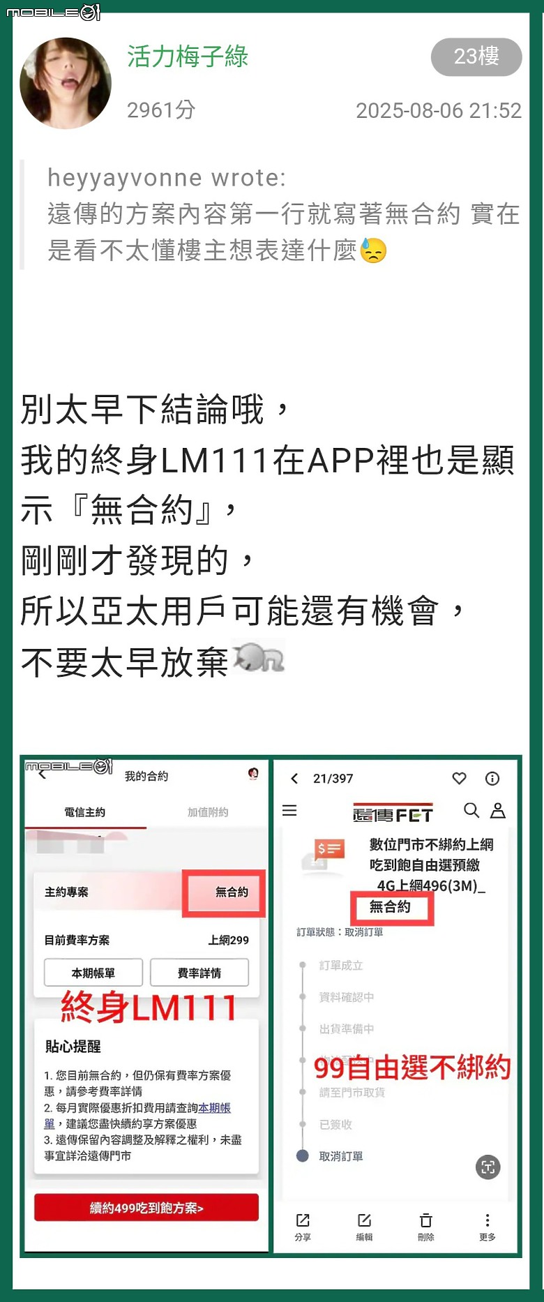 剛剛查看了我的終身LM211,遠傳app及網站都是主約顯示無合約然後看看家人的亞太138轉到遠傳後。遠傳app及網站顯示的是『數位門市新朋友138吃到飽(12Mbps)單門號_4G暢打799(12M)_無合約』看起來,遠傳是知道亞太的不綁約,應該就是終身約,畢竟不綁約不是沒合約,只是沒有定義期限。大家不用太緊張,反正不綁約的最壞情況,不留門號的就退租銷號,想留門號的就轉預付,