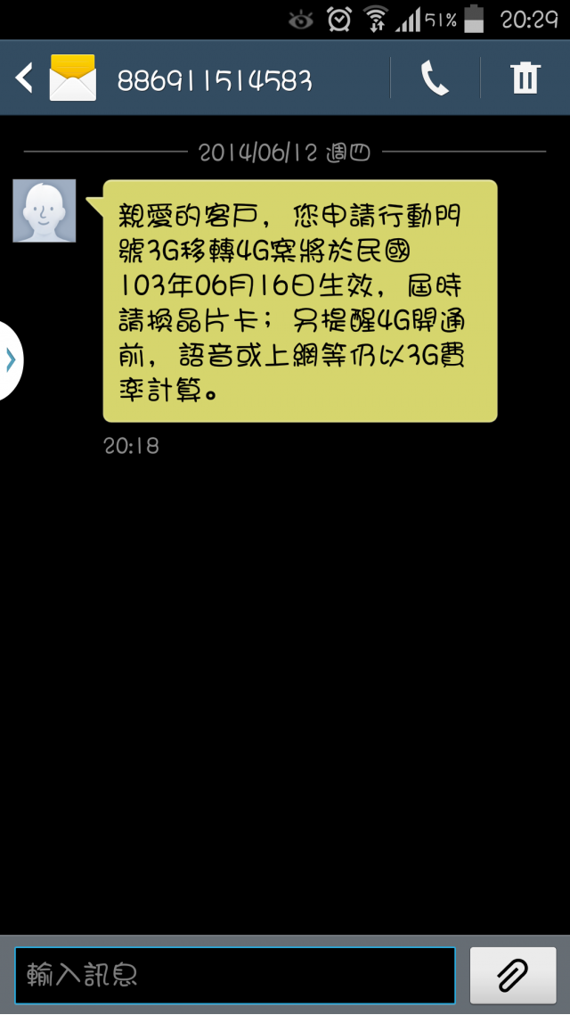 我是大省沒有買手機的,所以無法升為4G。問客服:如果當時簽約買3G手機,現在可以升級嗎?客服回答:可以。再問客服:所以自己有iphone5S,沒有跟中華綁約買手機,不能升級。綁約買3G,卻可以升級?是不是不合理?客服再答:是不合理。我想是神X公司庫存嚴重,所以出此招。